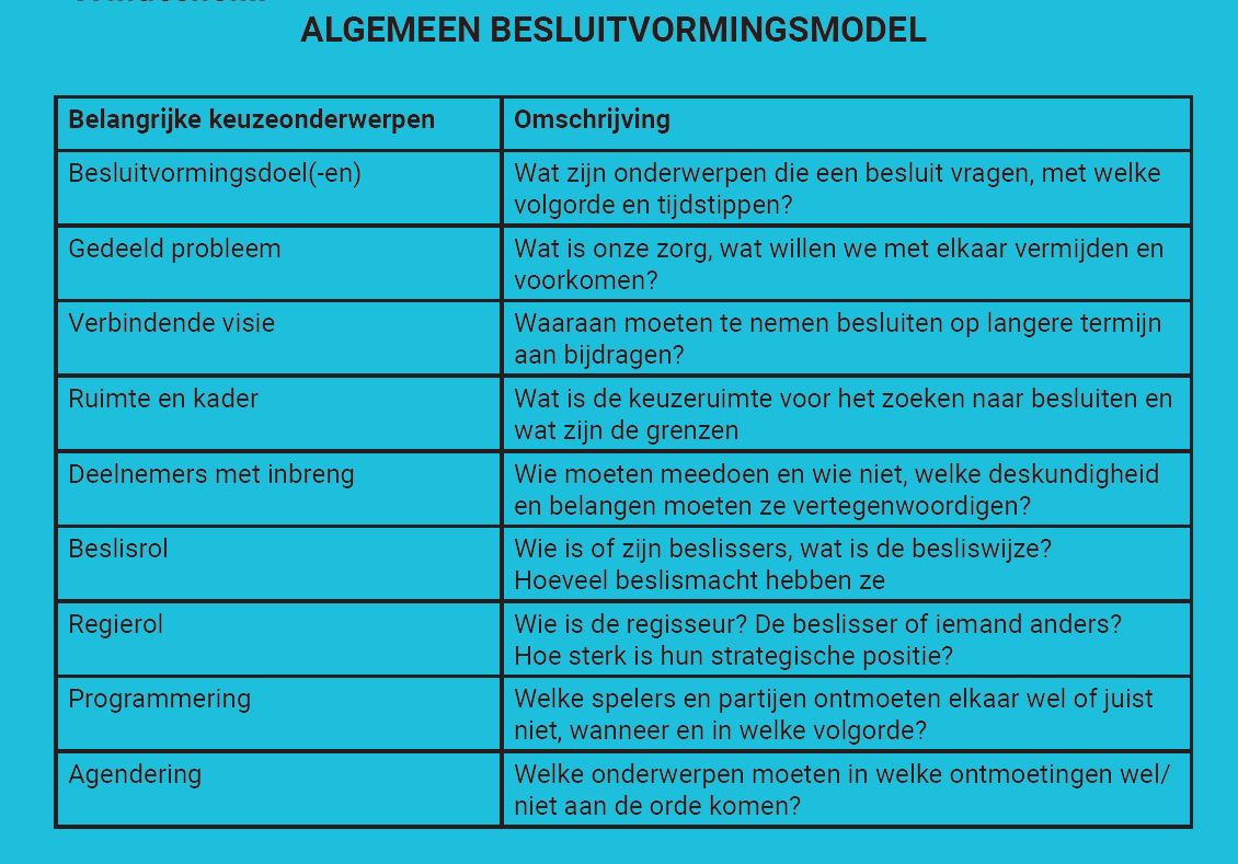 - voor elke deelnemende partij bepalen waar deze in het besluitvormingsproces zijn inbreng kan hebben;