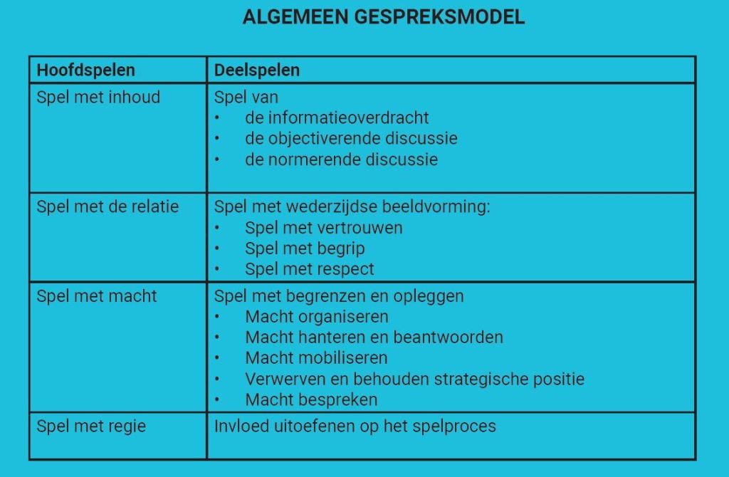- begeleiden van de interactie tussen de spelers. Werken met ‘tijdelijk werkbare overeenstemmingen‘ (Wierdsma en Swieringa, 2011).