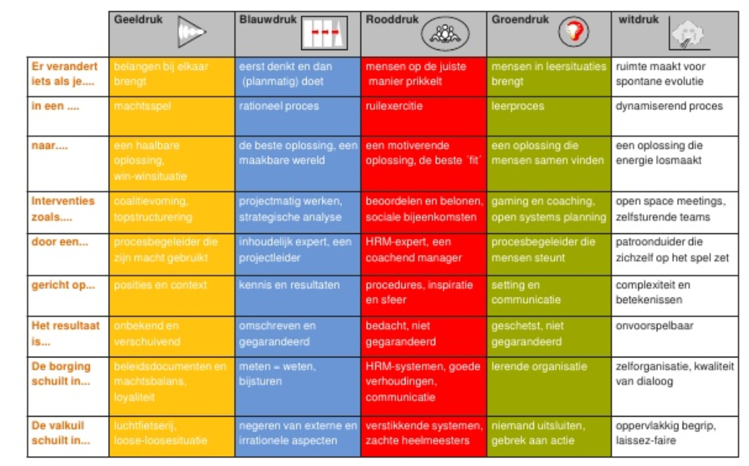 Een andere manier om naar veranderprocessen te kijken is die volgens de kleurentheorie van de Caluwé en Vermaak (2010). D.m.v. kleuren hebben zij een indeling gemaakt van verschillende dynamieken die een veranderaar in een organisatie kan tegenkomen en de bijbehorende aanpak die dit vergt.