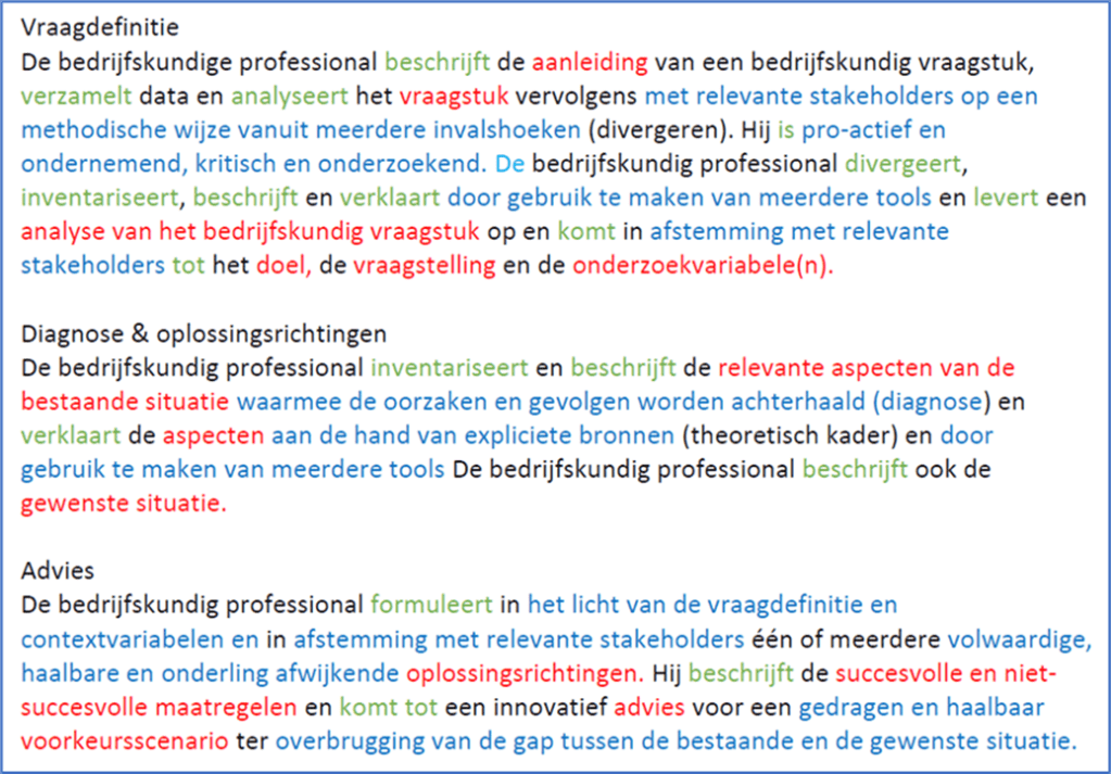 | Probleemoplossende vaardigheden | Identificeert en analyseert complexe en onvoorspelbare problemen in de beroepspraktijk en/of in het kennisdomein en lost deze op tactische, strategische en creatieve wijze op door gegevens te identificeren en te gebruiken. |