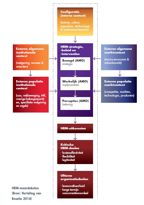 Onderzoek naar de wijze waarop strategisch HR-beleid bijdraagt aan het realiseren van organisatiedoelen heeft geresulteerd in de HRM-waardeketen. Deze keten beschrijft wat de verbindende schakels zijn die maken dat strategisch HR-beleid waarde toevoegt aan de opbrengsten van de organisatie (Boselie, 2014). Ontleend aan: VO-academie-VO-raad. (2014). Doelgericht vertrouwen. Strategisch HRM voor schoolleiders. Utrecht: VO-academy.