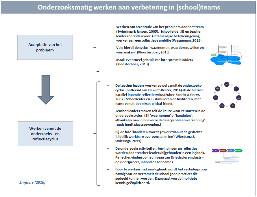 Effectieve verbetertrajecten starten vanuit een gezamenlijke visie op goed onderwijs (en de daarbij behorende collectieve ambitie). Aanleiding voor de wens tot verbetering is vaak het bestaan van een kloof tussen de actuele en de gewenste situatie (de gedroomde toekomst). Bij het onderzoeksmatig werken aan verbetering in de school is sprake van een collectief leerproces, hierbij kan bijvoorbeeld onderstaand stappenplan gevolgd worden (Snijders, 2016). Belangrijke elementen in deze voorgestelde aanpak zijn: lerend veranderen, gezamenlijke betekenisgeving, cyclisch werken en eigenaarschap.