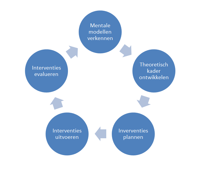Deze manier van werken heeft een bepaalde gelijkenis met de leercyclus, de onderzoekscyclus (ontleend aan Kiewiet-Kester, 2014. Bron: Loo, J. v., Lieskamp, M., & Zwart, C. (2015). Onderzoeksmatig leiderschap. Huizen: Pica onderwijsmanagement) en de cyclus “doen, bezinnen, denken, beslissen en weer doen” van Wierdsma en Swieringa (2011). Tip: gebruik eventueel de matrix ‘analyse van een interventie‘.