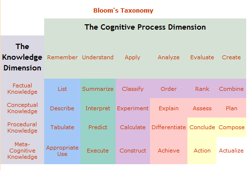 Fisher (2005) heeft de door Anderson en Krathwohl (2001) gereviseerde taxonomie van Bloom (lagere en hogere orde denken) aan de hand van de dimensies kennis en cognitieve processen in een tabel geplaatst.